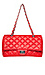 Quilted faux leather handbag featuring a woven chain strap, one exterior back pocket, three interior compartments, and three interior pockets.