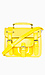 Neon satchel purse featuring three adjustable buckle straps on front, a clear fluorescent front pocket, detachable shoulder strap, and one interior zippered pocket.