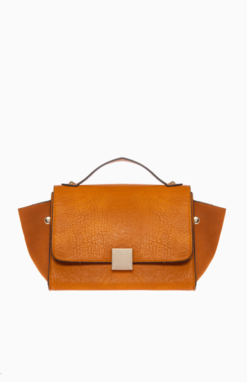 Mini handbag featuring winged sides with snap buttons to maintain shape, one interior zippered pocket, and a detachable chain link shoulder strap.