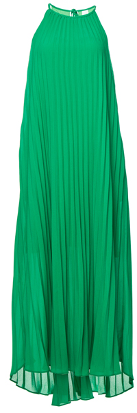 Accordion pleated maxi dress featuring a self tie neck with wooden beads at ends, invisible in seam hip pockets, and partial lining from top to thigh. By Line & Dot.