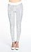 Skinny pants with silver sequins on front. Hidden side zipper. Two back mock pockets with decorative crystal buttons.
