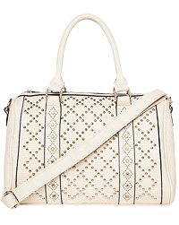 Textured faux leather handbag with studded diamond pattern on front, detachable shoulder strap and 3 interior pockets (1 zippered, 2 open).
