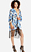Lightweight kimono featuring a floral print, tassel fringe on hem, 3/4 length sleeves, and split side seams.