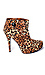 Leopard print suede booties. Point toe, hidden platform, side zip, one button side detail.