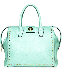 Large tote bag with cone stud border on front, detachable shoulder strap, 1 exterior zippered pocket, and 4 interior pockets (2 zippered, 2 open).